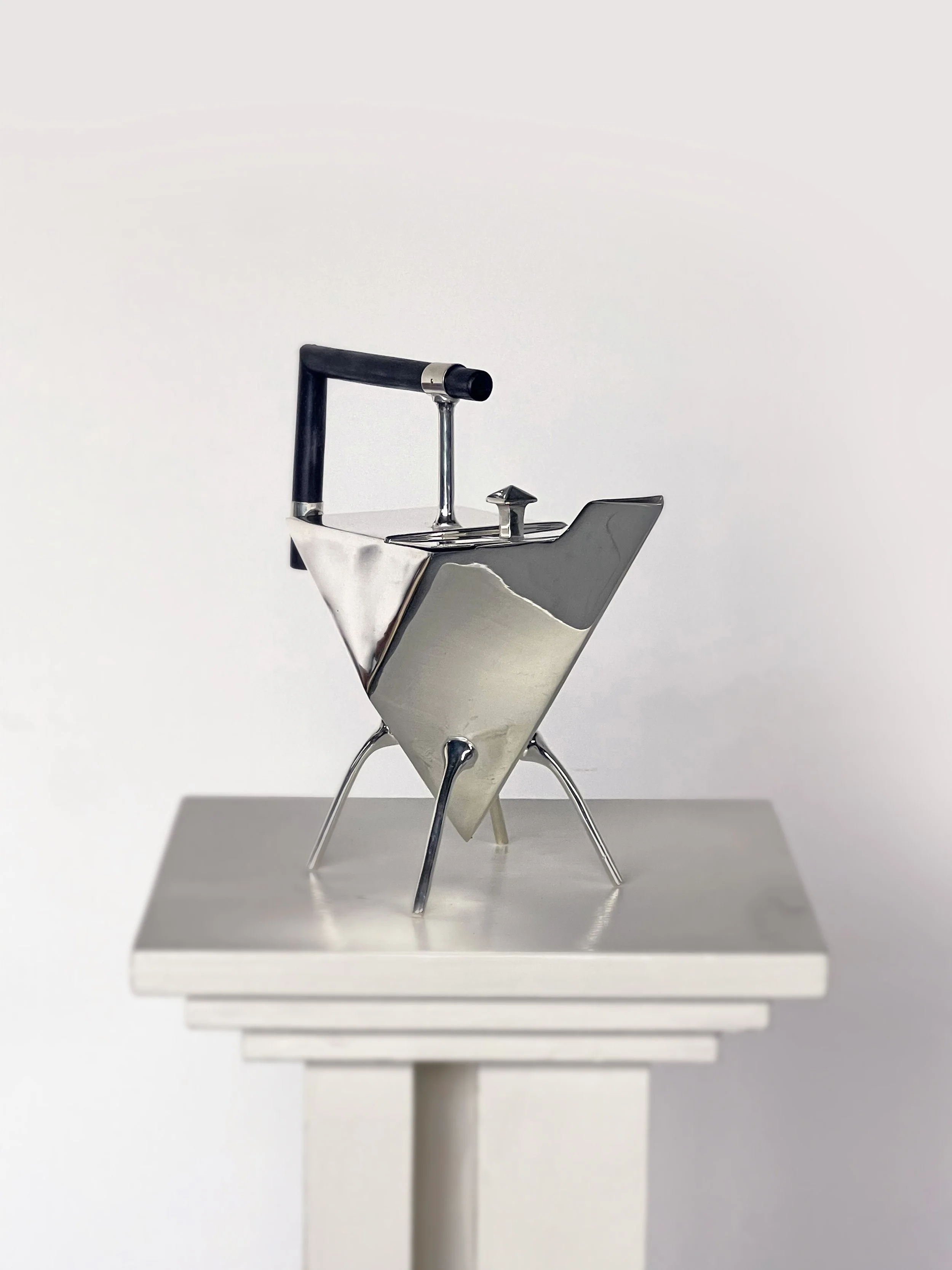 A rare form, hexagonal faceted ornate teapot. Silver plated with manufacture stamp. Elevated on deco style feet.